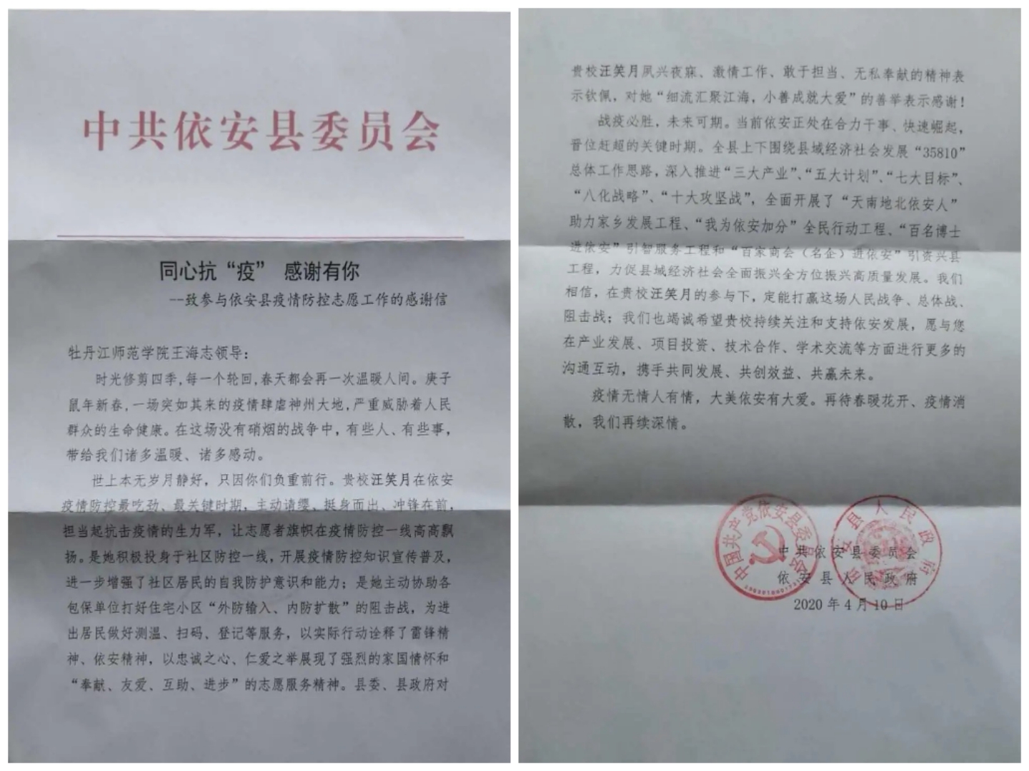 近日,我校文学院收到一封来自依安县委、县政府的感谢信,对我校文学院2017级汉语言文学专业学生汪笑月在家乡疫情防控工作中的突出表现予以表彰和感谢。