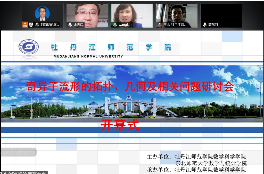5月16日—18日,由我校数学科学学院、东北师范大学数学与统计学院联合举办,我校科研处、数学科学学院承办的“奇异子流形的拓扑、几何及相关问题研讨会”在腾讯会议平台举行。来自全国各地高校的专家、学者及研究生100余人参会。我校科研处处长金志民,数学科学学院院长王岚、党委书记张启龙、副院长王冰,数学一级学科带头人张璞、二级学科带头人刘海明,数学科学学院部分教师和研究生参加了会议开幕式。开幕式由数学科学学院院长王岚主持。