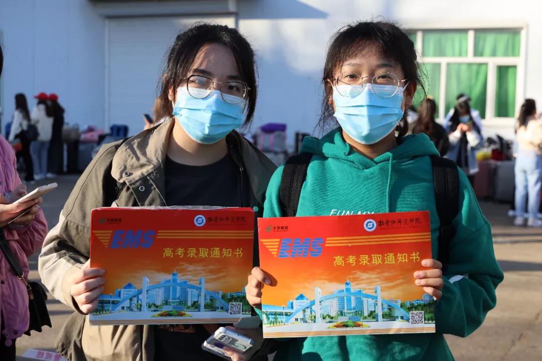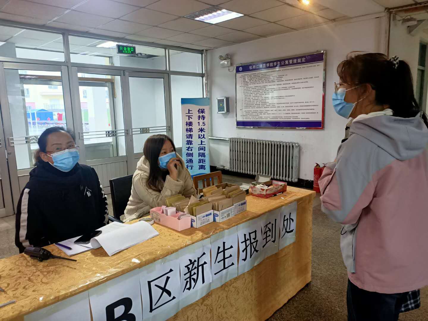 在学校北门,新生经过核验录取通知书、扫码测温后进入校园,在志愿者的引导下到二级学院行李存放处寄存行李,抽签分配寝室。学校特地为学生制作了暖心行李贴。