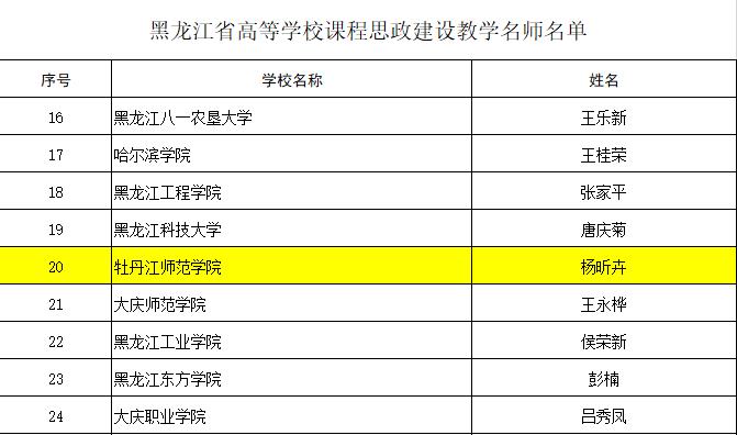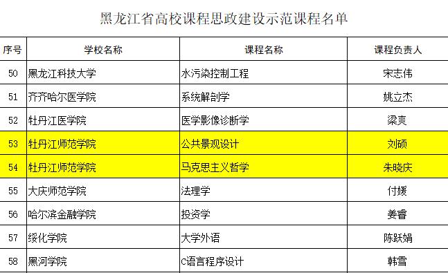 近日,黑龙江省教育厅公布了《2020年黑龙江省高等学校课程思政建设示范高校、示范课程、教学名师和教学团队名单》。我校获批“2020年黑龙江省高等学校课程思政建设示范高校”;校级课程思政建设示范课程美术与设计学院刘硕老师的《公共景观设计》、马克思主义学院朱晓庆老师的《马克思主义哲学》获批“2020年黑龙江省高等学校课程思政建设示范课程”;校级课程思政建设教学名师物理与电子工程学院杨昕卉教授获批“2020年黑龙江省高等学校课程思政建设教学名师”。