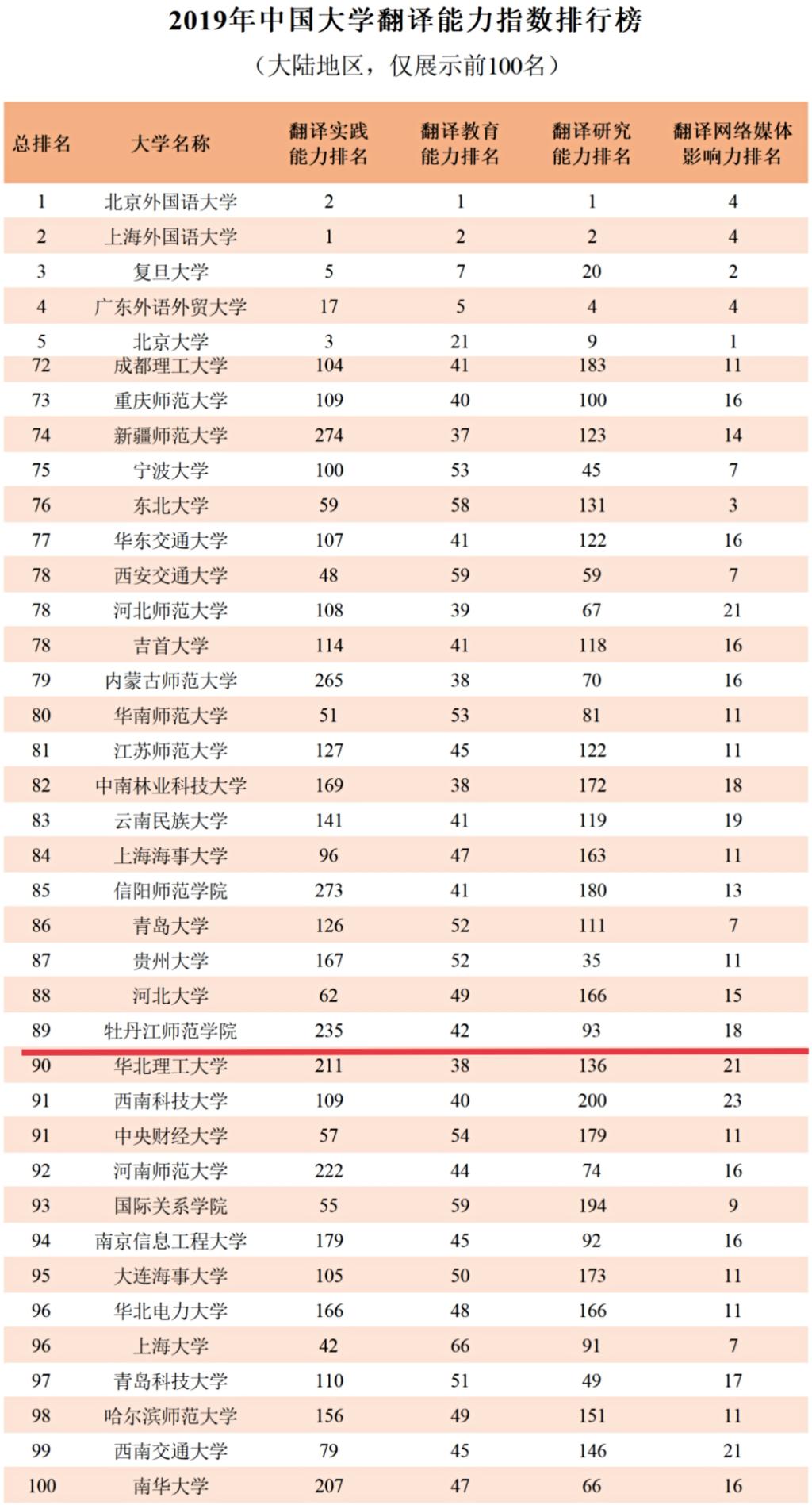 在北外5月22日首发的全球国家翻译能力指数和中国大学翻译能力指数排行榜上,我校翻译专业挺进前一百,位列第89名,其中翻译教育能力排名42,翻译研究能力排名93,翻译网络媒体影响力排名18。我校是黑龙江省三所入选高校之一,这是对我校翻译专业多年来坚持“五位一体”教学模式培养翻译人才成效的充分肯定。