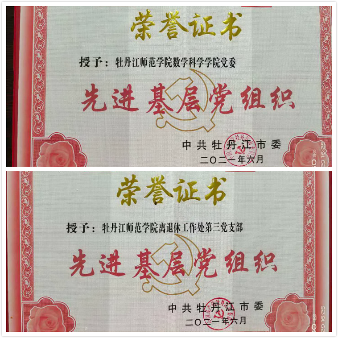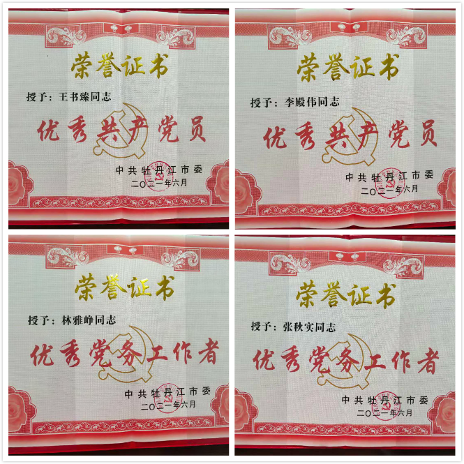 2021年是中国共产党成立一百周年,为表彰先进、弘扬正气,树立榜样,进一步发挥基层党组织的战斗堡垒作用和广大党员的先锋模范作用,中共黑龙江省委、牡丹江市委相继开展了“两优一先”推荐评选工作。我校化学化工学院本科生党支部被授予黑龙江省“先进基层党组织”。我校后勤管理处王书臻、研究生学院李殿伟被授予牡丹江市“优秀共产党员”,数学科学学院林雅峥、计算机与信息技术学院张秋实被授予牡丹江市“优秀党务工作者”,数学科学学院党委、离退休工作处党委第三党支部被授予牡丹江市“先进基层党组织”。
