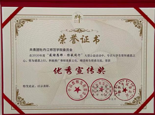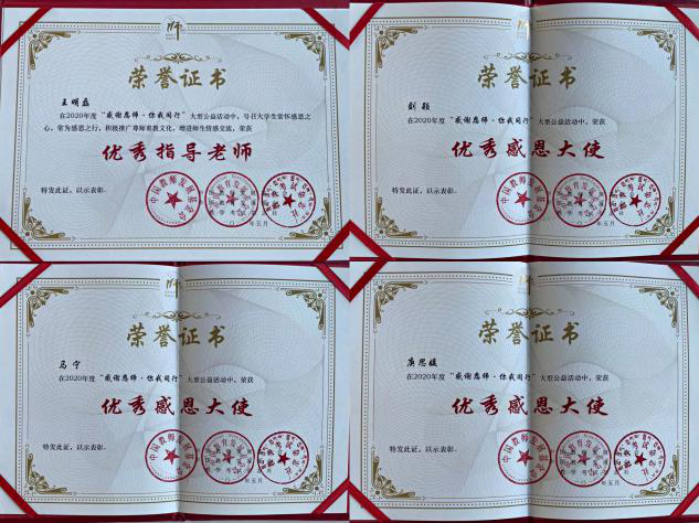 近日获悉,在教育部教师工作司指导,中国教育学会、中国教育科学研究院支持,中国教师发展基金会和中国教育发展基金会主办的全国高校2020年度“感谢恩师·你我同行”大型公益活动中,共青团开云体育APP下载委员会荣获“优秀组织金奖”“优秀宣传奖”;校团委社会实践部副部长王明磊荣获“优秀指导老师”荣誉称号;计算机与信息技术学院刘颖、马宁,教育科学学院庚思媛荣获“优秀感恩大使”荣誉称号。