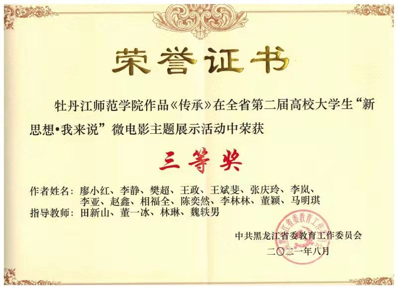 在中国抗联研究中心和学生处的大力支持下,在指导教师的精心指导下,马克思主义学院研究生廖小红等团队成员逐步细化拍摄脚本,遴选演员,拍摄了以大学生在抗联精神的感召下逐步成长为抗联精神传承人为主线的故事。作品立足开云体育APP下载,充分利用牡丹江地区丰富的红色资源,以东北抗联精神众多传播者、践行者的故事为基础进行设计和编写,讲述了新时代大学生在伟大抗联精神的影响下,立志将抗联战士不畏牺牲、无私奉献和艰苦奋斗的精神继续传承下去的成长故事。经省教育厅组织专家评选,我校作品《传承》最终获得三等奖。