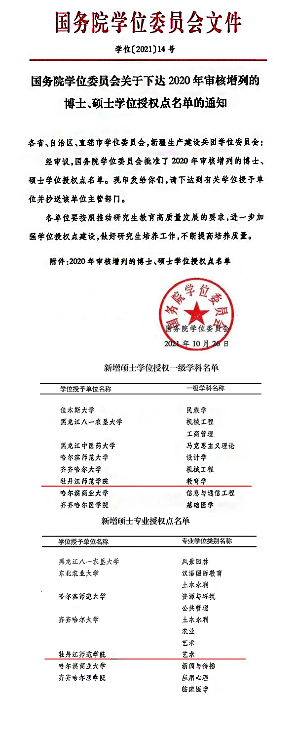 近日,国务院学位委员会印发了《关于下达2020年审核增列的博士、硕士学位授权点名单的通知》(学位[2021]14号)文件,我校获批新增“教育学”硕士学位授权一级学科、“艺术”硕士专业学位授权点。
