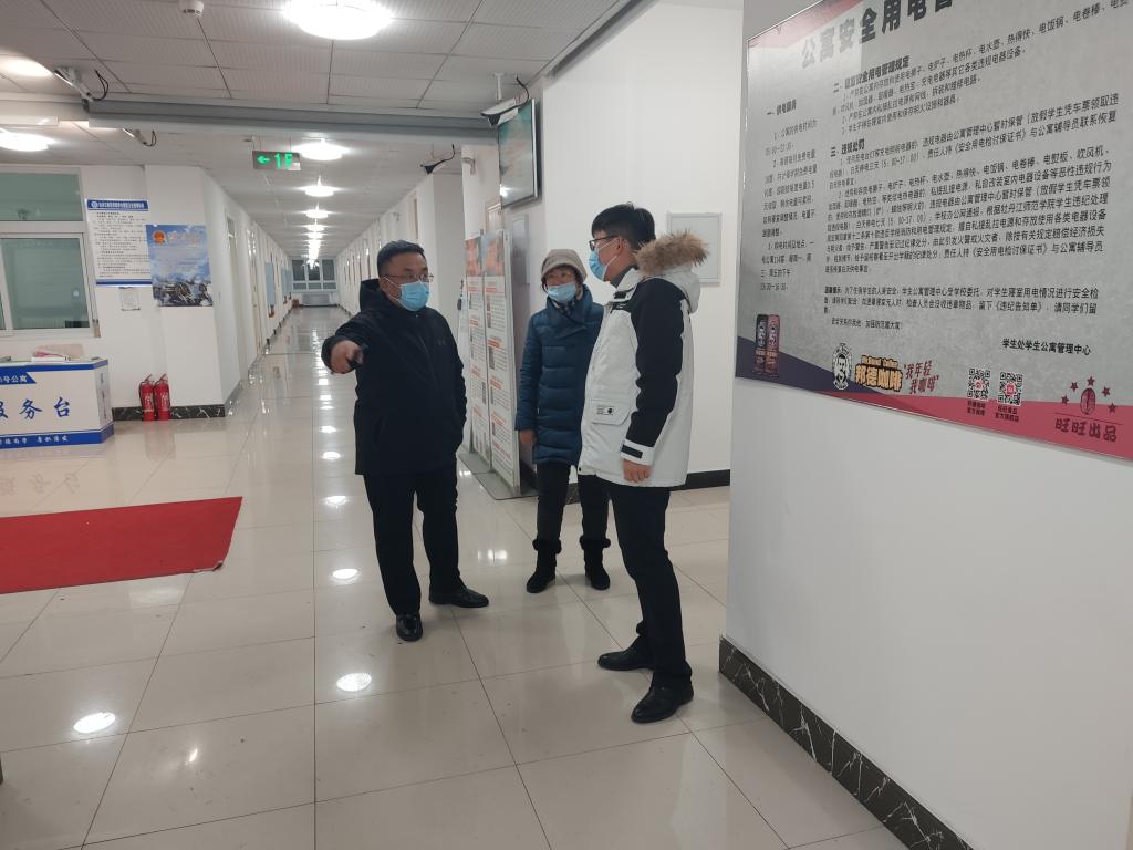 在16号公寓楼,张燕梁书记仔细查看了环境卫生、用电安全、消防安全情况,并深入部分学生寝室与学生亲切交流,询问学生的个人情况,了解同学们期末复习和生活状况,勉励大家努力学习,认真备考,并叮嘱同学们注意用电安全和寝室卫生。