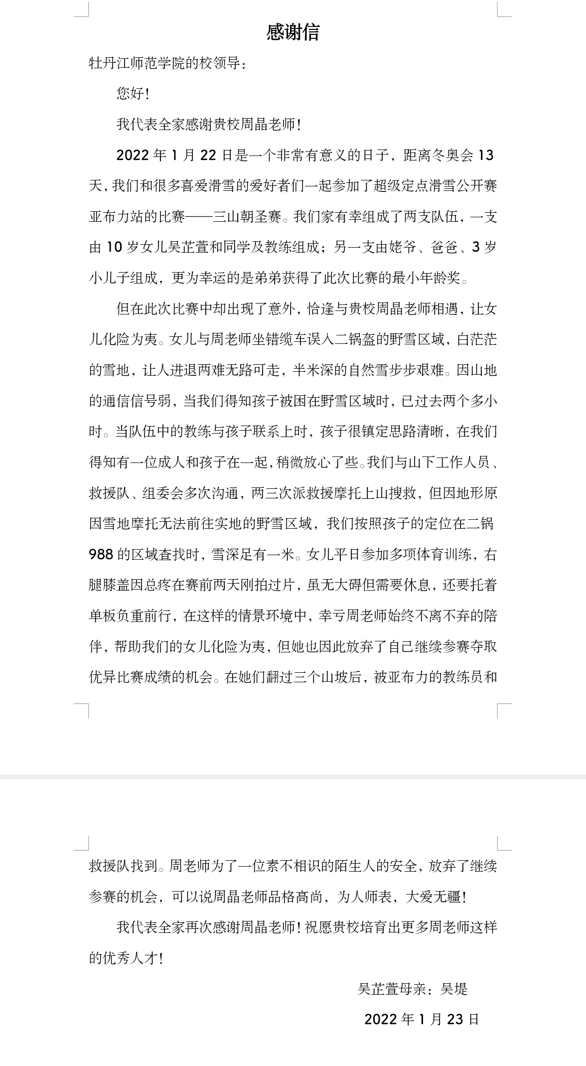 “由衷地感谢周晶老师,感谢周老师为了一位素不相识的陌生人的安全,放弃了继续参赛的机会,周晶老师品格高尚、为人师表、大爱无疆……”1月25日,学校收到了一封饱含深情的对我校经济与管理学院辅导员周晶的感谢信。