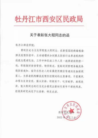 近日,学校收到一封来自牡丹江市西安区民政局的表彰函,对我校历史与文化学院张大程同志参加重点防控行业养老机构的抗疫志愿服务工作给予充分肯定。张大程同志积极肯干、吃苦耐劳、表现优异,充分展现了新时代青年干部的风采,树立了牡师院教师有责任、敢担当的形象。