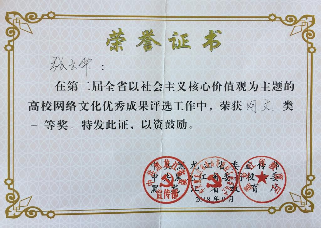 日前,第二届全省以社会主义核心价值观为主题的高校网络文化优秀成果评选工作圆满结束。全省27所高校师生报送研究报告、微课、网文、网络公益广告、微电影五类100项成果参评,我校马克思主义学院副教授张云霞的网络文章《坚守党的初心与使命——东北抗联精神与红船精神》获得网文类一等奖;文学院教授宋明华的研究报告《新媒体时代黑龙江流域少数民族手工艺传播策略研究》获得研究报告类二等奖。