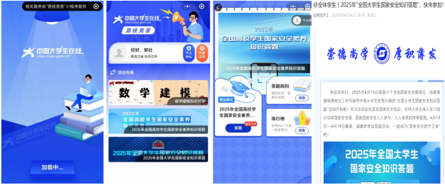 4月12日-15日,学校开展“全国大学生国家安全知识答题”活动,引导大学生深入学习践行总体国家安全观,营造国家安全人人参与,人人有责的浓厚氛围,全校学生参与答题10000余人。