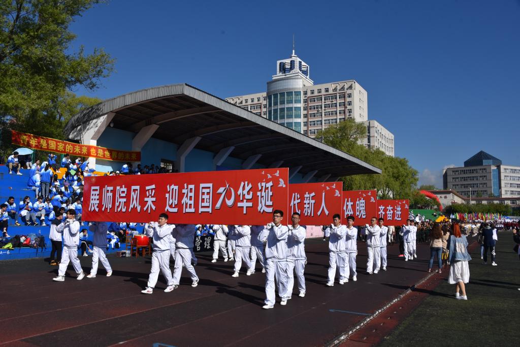 在国旗、校旗、会旗护卫队的引领下,伴随着激昂奋进的《运动员进行曲》,各代表队入场式拉开序幕。鼓乐队、花束队、花环队、彩旗队、职能部门及各二级学院学生、教师方队代表穿着整齐的服装,喊着嘹亮的口号,英姿飒爽,意气风发,迈着矫健而整齐的步伐走过主席台,接受大会检阅,向全校师生及观众朋友们展现他们的风采和魅力。在庄严肃穆的国歌和慷慨激昂的校歌声中,国旗、校旗先后在运动场上冉冉升起。
