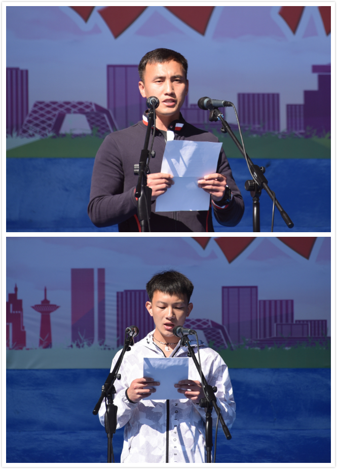 运动员方阵检阅结束,体育科学学院教师刘路辉代表全体裁判员宣誓,他表示全体裁判员将认真执行竞赛规则、尊重参赛选手,公正准确、严肃认真、谦逊谨慎、团结协作。化学化工学院学生程鹏飞代表运动员宣誓,他表示全体运动员将以积极饱满的态度,在竞赛中顽强拼搏、听从指挥、尊重对手、服从裁判,赛出风格、赛出水平。
