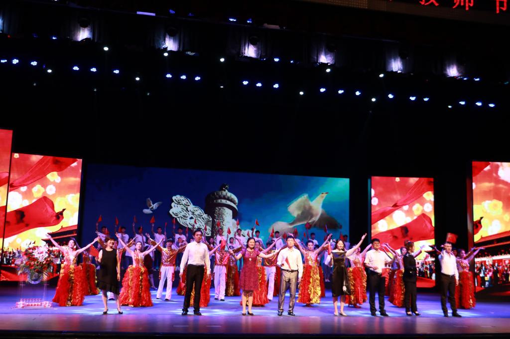 此次表彰大会由“初心守望”“教师荣光”“使命传承”三个篇章组成,内容丰富、形式多样、精彩纷呈,采用教师表彰与文艺演出交叉错落进行的方式,张弛有度,高潮迭起。一首激昂豪迈的赞歌《我和我的祖国》,拉开了表彰大会的序幕,优美的旋律,动听的歌喉,表达了师生们对伟大祖国的敬意和祝福,传递着对老师们辛勤付出的深深感激;音乐与舞蹈学院的杨光宇深情献唱,一首《老师,我想你》深情地诉说和表达了对老师的无比崇敬与无限感恩之情;由张应力教授倾情编导,朗读者协会师生真情演绎的诗朗诵《教师之爱》将本次表彰大会推向高潮,字字铿锵,句句含情,时而豪迈奔放,时而慷慨激昂,时而细腻深情,他们用自己的理解和演绎表达着对教师这一神圣职业的赞美,向为人师者致以崇高的敬意和诚挚的祝福,体现了全校教工不忘初心、牢记使命的思想共识和使命担当。