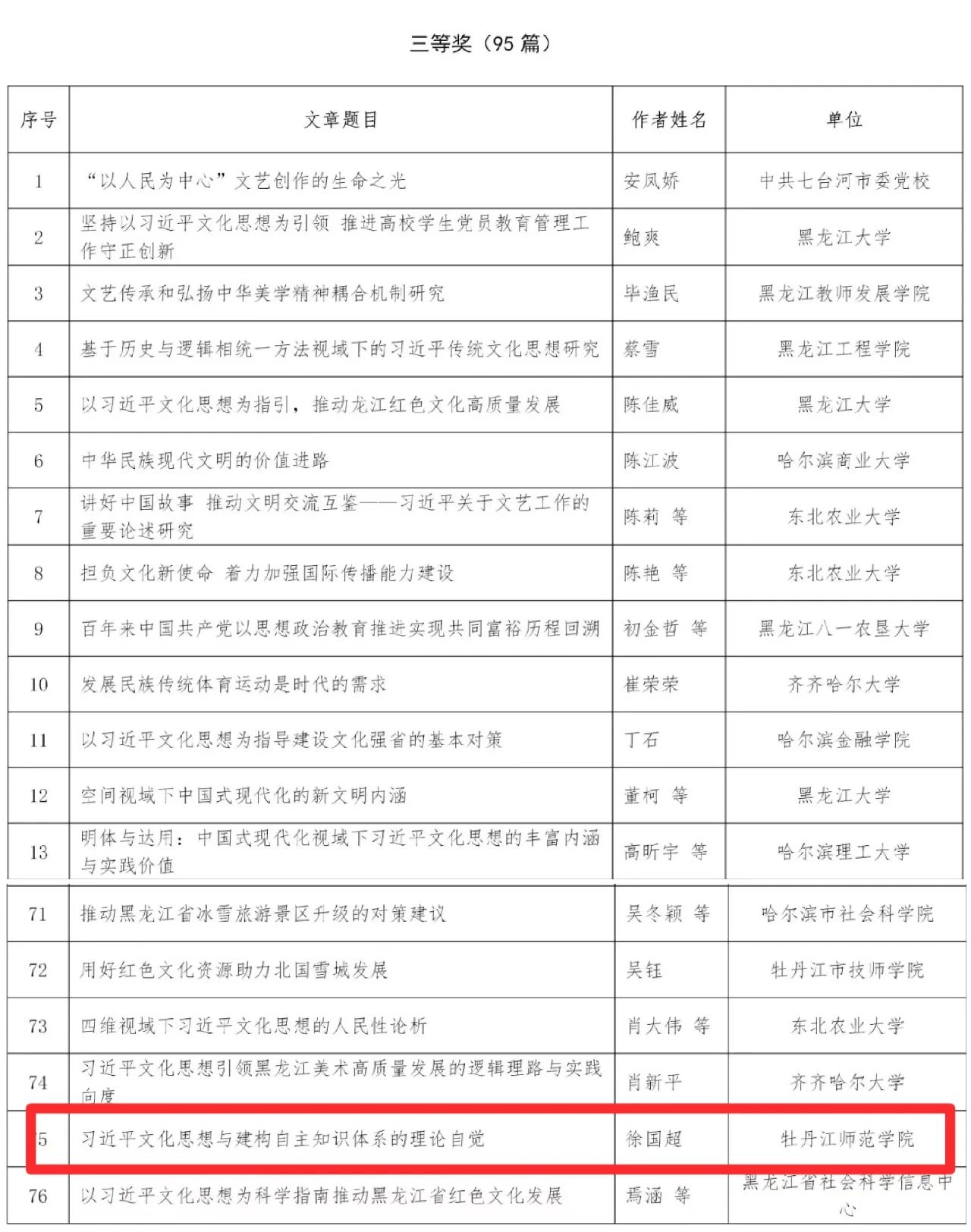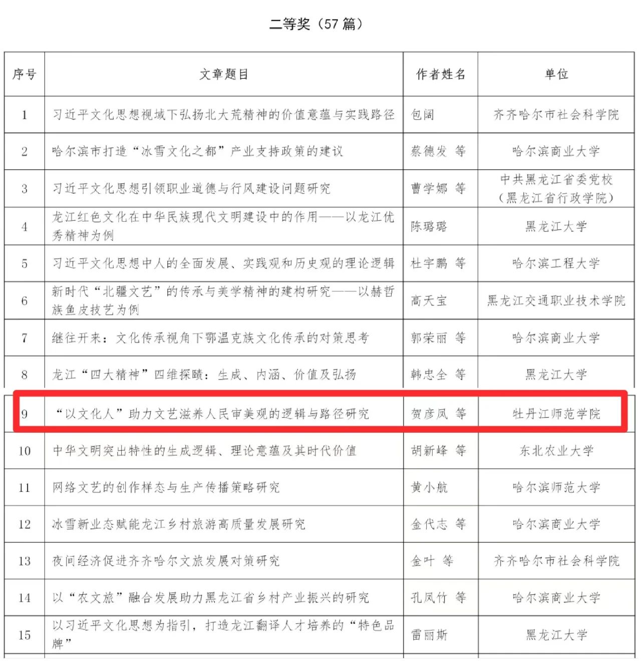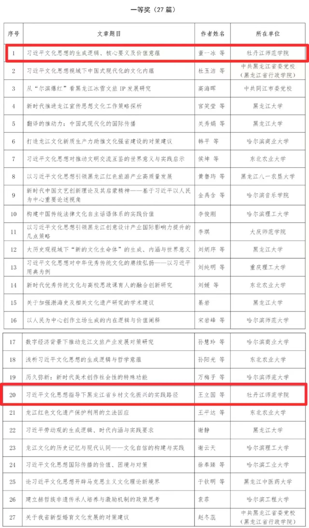 近日,由省社科联、省文联联合开展的“习近平文化思想研究”主题征文比赛公布获奖结果。我校喜获多项佳绩,其中,马克思主义学院教师董一冰的文章《习近平文化思想的生成逻辑、核心要义及价值意蕴》、历史与文化学院党委书记王立国的文章《习近平文化思想指导下黑龙江省乡村文化振兴的实践路径》荣获一等奖;马克思主义学院教师贺彦凤的文章《“以文化人”助力文艺滋养人民审美观的逻辑与路径研究》荣获二等奖;马克思主义学院教师徐国超的文章《习近平文化思想与建构自主知识体系的理论自觉》荣获三等奖。开云体育APP下载社会科学界联合会荣获“优秀组织奖”。