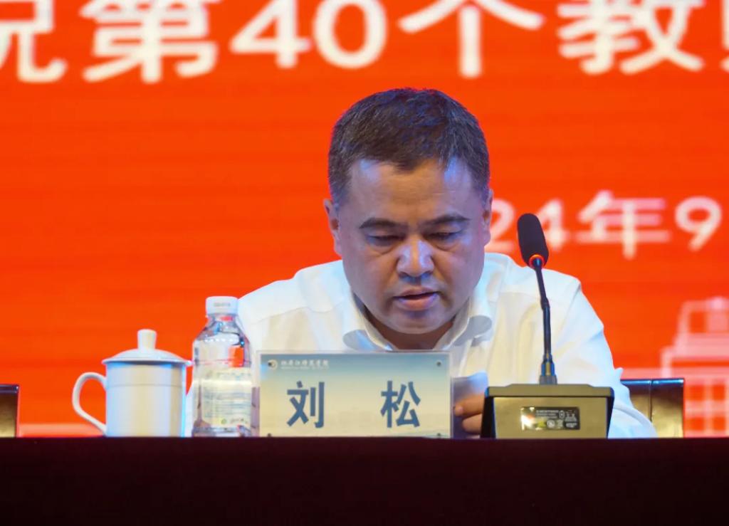 9月10日下午,学校在音乐厅举办庆祝第40个教师节表彰大会,大会以“大力弘扬教育家精神 加快建设教育强国”为主题。学校领导王志浩、李春江、刘松、张燕梁、张艳霞、张冰、张晓祥、孙伯勇、刘恒文,全校教职工,获奖教师代表,退休老同志代表,从教(管理服务)30年、40年教职工代表,新入职教职工代表,优秀校友代表,学生代表参加会议。党委副书记刘松主持会议。