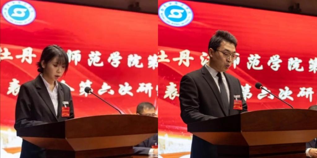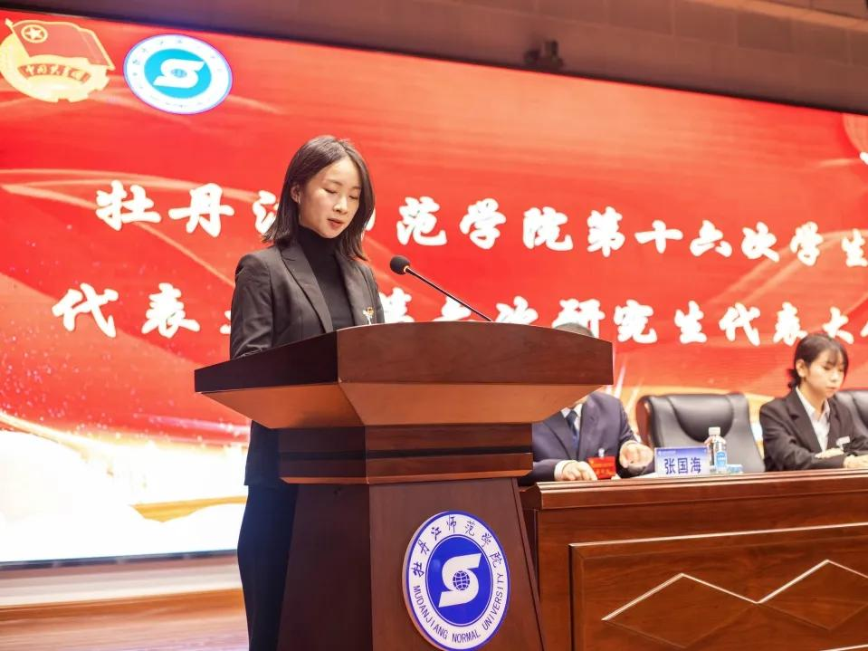 牡丹江医科大学学生会主席张秋雨、研究生会主席团代表李旭东致贺词