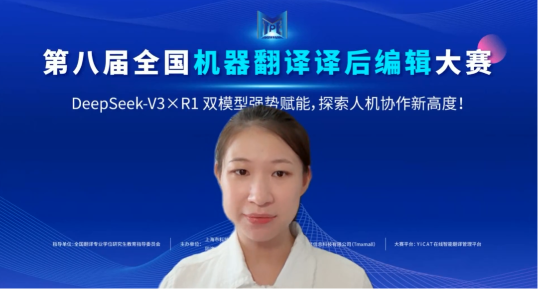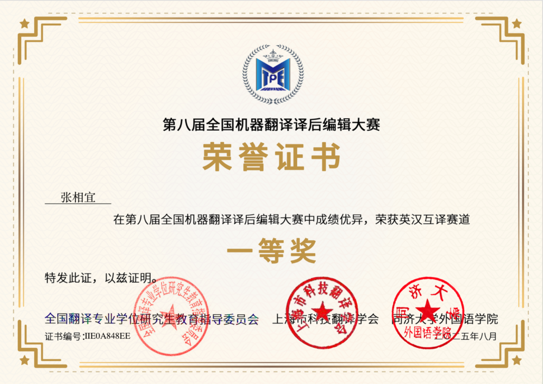 近日,第八届全国机器翻译译后编辑大赛圆满落幕。我校应用英语学院学子继去年摘得特等奖后再次夺魁,2024级翻译硕士研究生张相宜、王晓彤、张欣颖三位同学凭借卓越实力,分获一等奖、二等奖和优胜奖。黄永媛、孙海一、沈艳蕾三位老师荣获“优秀指导教师”。颁奖典礼上,张相宜同学作为获奖代表线上发言,分享参赛心得与成长感悟,展现了我校学子出色的专业素养与精神风貌。