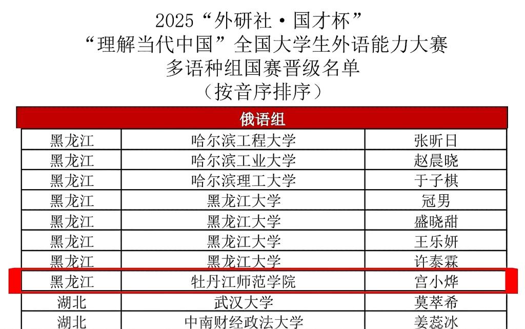 近日,2025“外研社·国才杯”“理解当代中国”全国大学生外语能力大赛省级复赛圆满落幕。东方语言学院俄语专业2022级学生宫小烨凭借扎实的语言功底、出色的综合素养,在多语种组激烈角逐中脱颖而出,成功斩获省赛金牌,获得国赛的晋级资格,将代表学校征战全国总决赛。