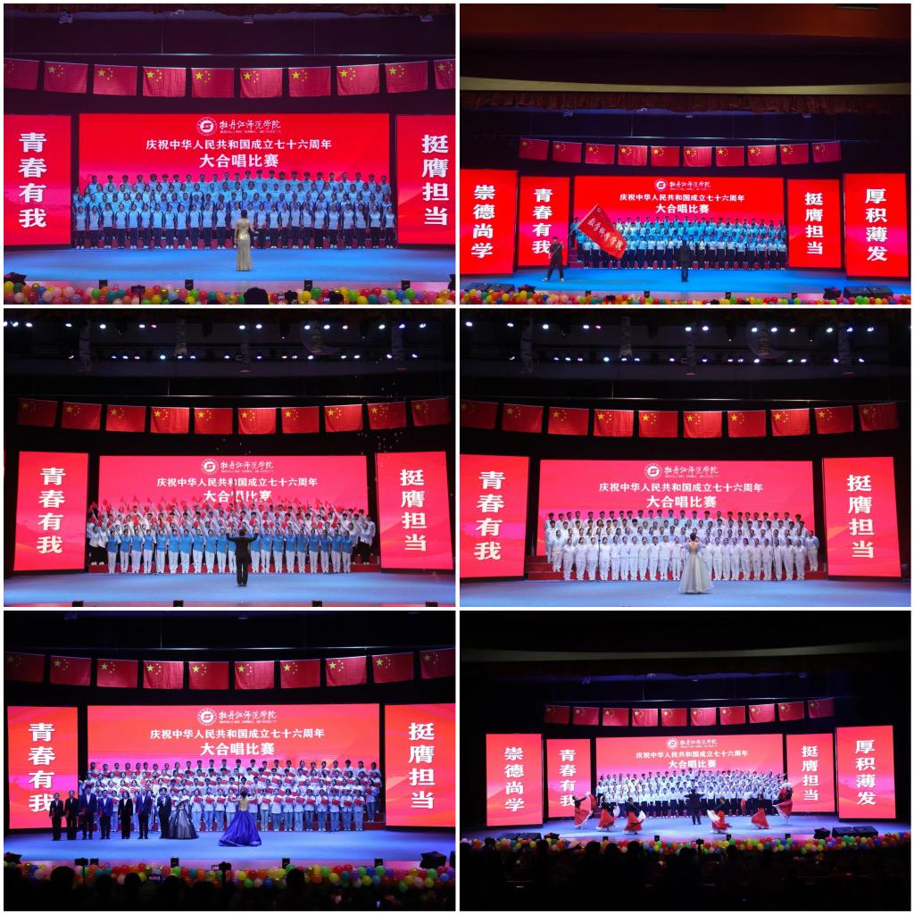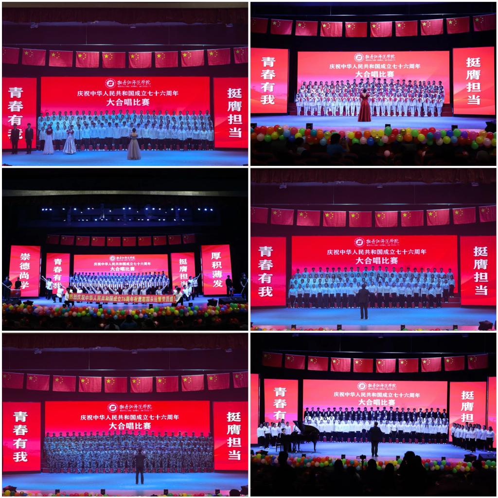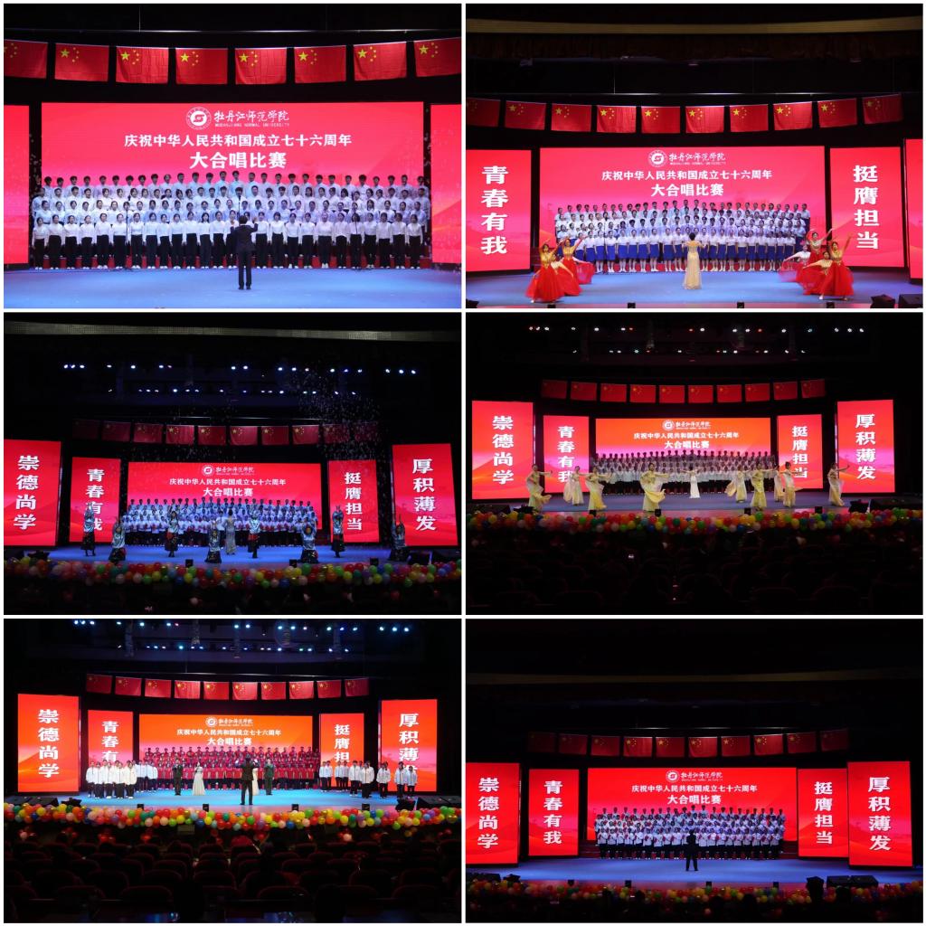 为热烈庆祝中华人民共和国成立76周年,大力弘扬爱国主义精神,激发全校师生的爱国热情,9月24日下午,学校庆祝中华人民共和国成立76周年大合唱比赛在第一音乐厅举行。此次活动吸引了全校4000余名师生参与或观看,以激昂的歌声为祖国送上深情祝福。学校领导刘松、张艳霞、张晓祥、孙伯勇、贲利、刘恒文、朱国兴亲临现场共同见证这一热血沸腾的时刻。牡师青年以铿锵歌声深情礼赞伟大祖国,表达对祖国华诞的美好祝福。