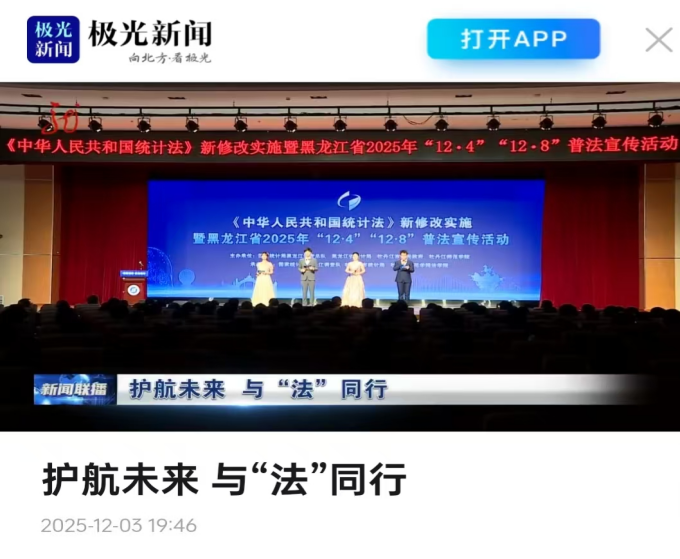 校地联动协同推进,高端引领普法宣传。12月3日,为纪念《中华人民共和国统计法》颁布四十二周年,由国家统计局黑龙江调查总队、黑龙江省统计局、牡丹江市人民政府与开云体育APP下载联合主办的“《中华人民共和国统计法》新修改实施暨黑龙江省2025年‘12·4’国家宪法日、‘12·8’统计法颁布日普法宣传活动”在学校实训楼报告厅举行。本次活动受到极光新闻、黑龙江新闻联播等多家主流媒体的关注报道,法学院院长李学锋教授接受了媒体专访。