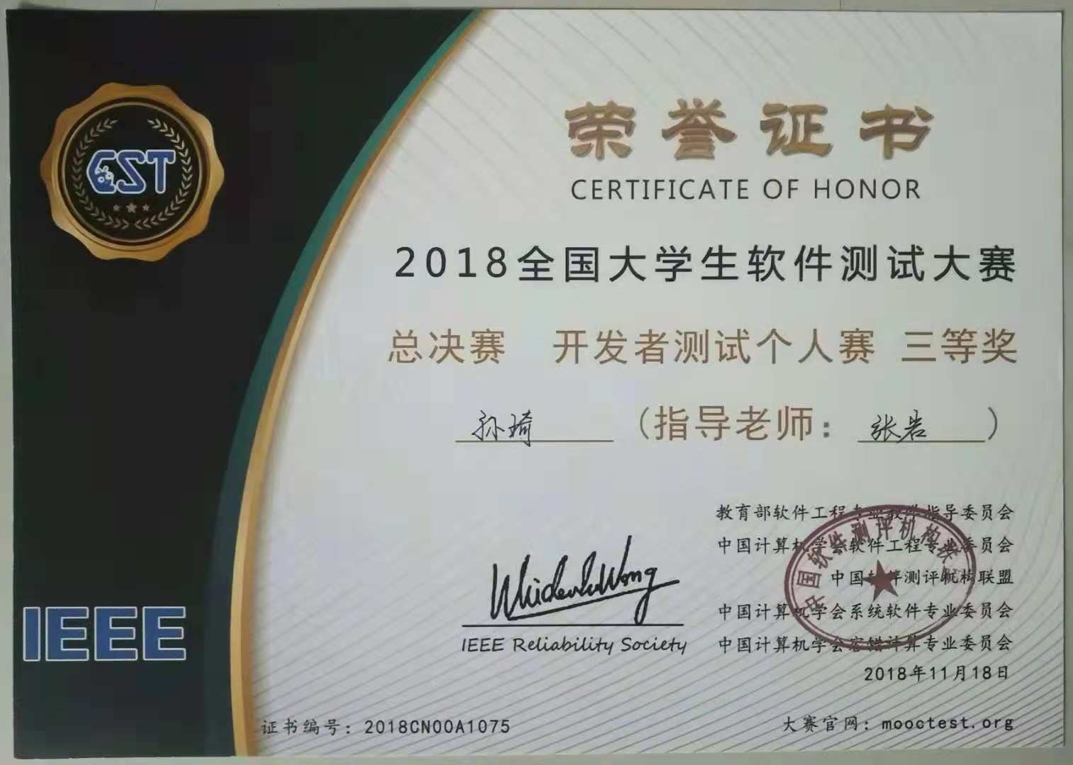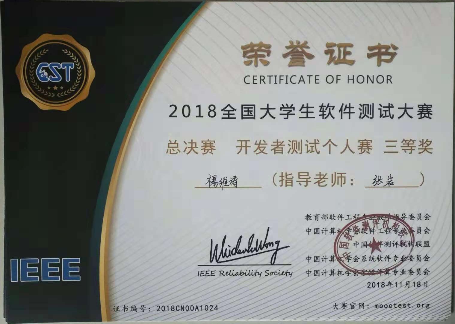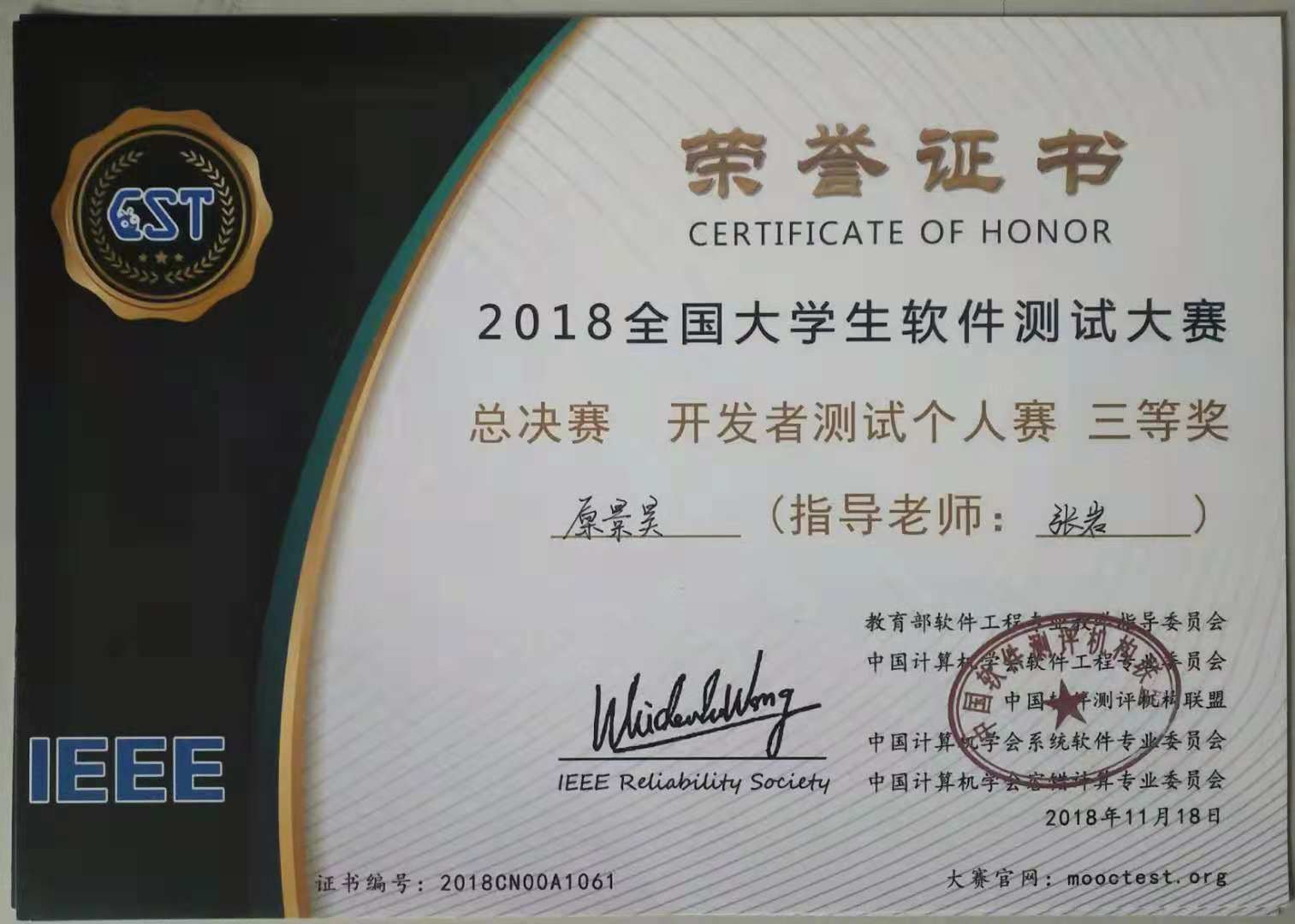 由于在省赛中的出色表现,我校作为黑龙江省唯一一所参加2018年全国软件测试大赛总决赛的高校,由计算机与信息技术学院学生杨维涛、原景昊、孙琦代表黑龙江省参加全国总决赛。经过激烈的角逐,3名学生在张岩、柴宝杰等教师的指导下,荣获全国三等奖,其中杨维涛获得该赛项全国第24名的好成绩。