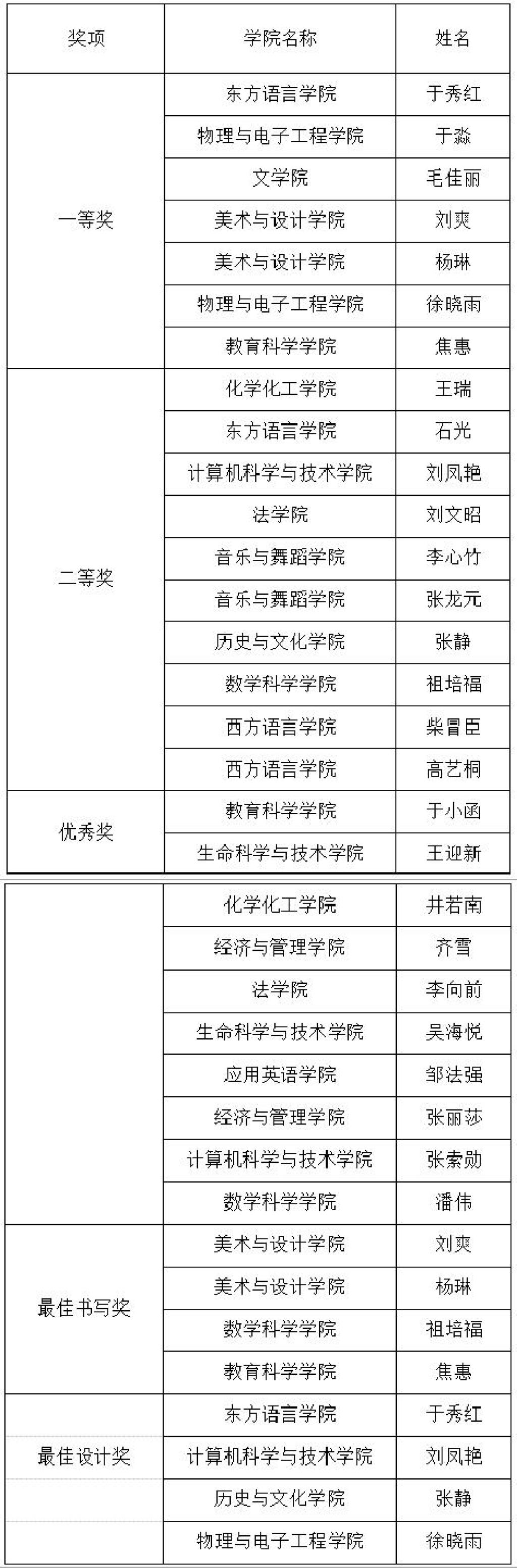 比赛过程中,参赛教师沉着应战,充分发挥其专业特长。流畅规范的板书设计与富有创意的板画作品,展现了扎实的教学基本功。评委组从教学设计创新性、书写规范性、视觉呈现效果及特色创新性等多个维度进行综合评定,东方语言学院于秀红等7名教师荣获教师板书比赛一等奖,化学化工学院汪洋等3名教师荣获教师板画比赛一等奖;化学化工学院王瑞等10名教师荣获教师板书比赛二等奖,物理与电子工程学院田祎然等5名教师获教师板画比赛二等奖;教育科学学院于小涵等10名教师荣获教师板书比赛优秀奖,法学院王晶等4名教师获教师板画比赛优秀奖。此外,为表彰在特定领域表现突出的教师,组委会特别设立了最佳教学设计奖、最佳书写规范奖、最佳创意构思奖和最佳视觉效果奖等专项奖项。